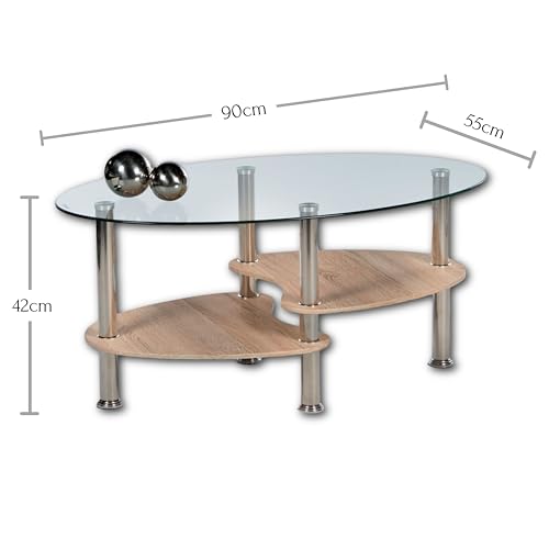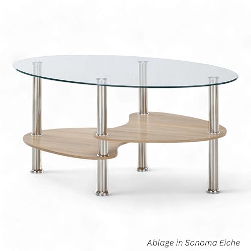 MODERN – Mit seiner ovalen Tischplatte aus klarem Sicherheitsglas, den zwei organisch geformten Ablageflächen und dem stabilen Edelstahlgestell bietet dieser Couchtisch ein zeitloses Design.