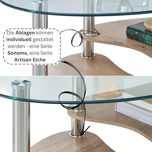 VIELSEITIG – Die Ablageflächen sind einseitig in Artisan Eiche Optik und einseitig in Sonoma Eiche Dekor gestaltet, was die Anpassungsfähigkeit bietet, den Tisch individuell an die Einrichtung anzupassen.