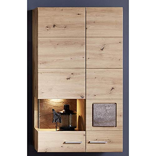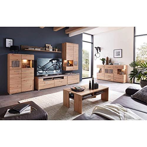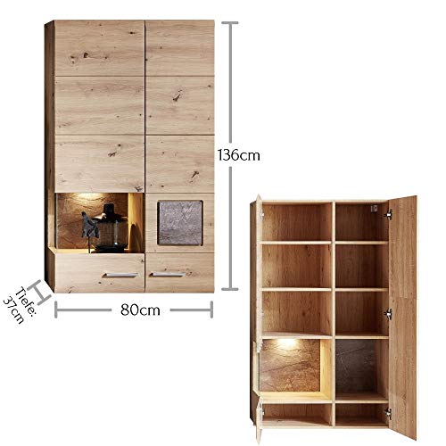 EYECATCHER – Diese Vitrine darf in keiner Wohnung fehlen. Durch das ausdrucksstarke Holz in Verbindung mit dem warmen Licht der LED Beleuchtung entsteht ein gemütlicher Wohnbereich.