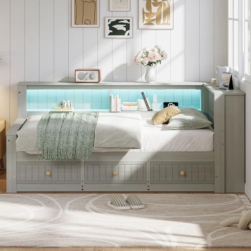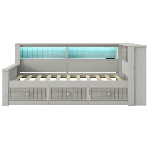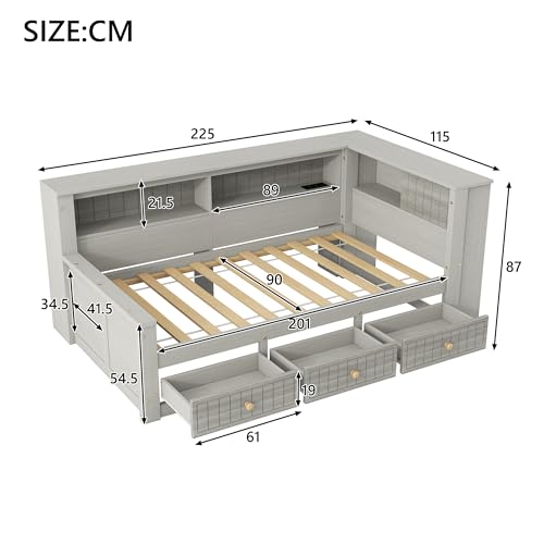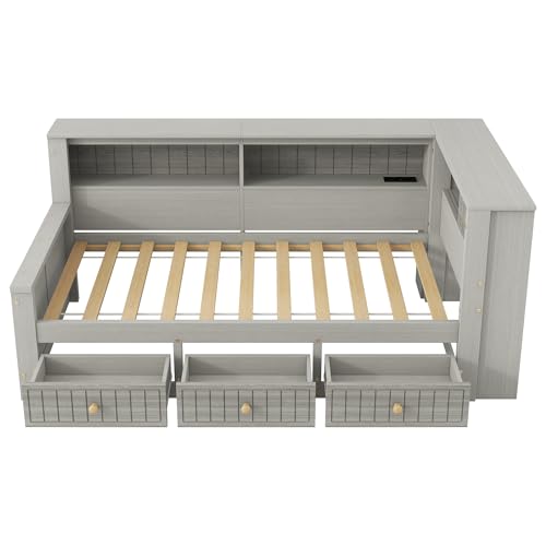 Tagesbett ganz Holz, 90 x 200 cm, mit Ablagefächern und 3 Schubladen, Grau