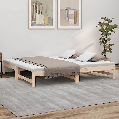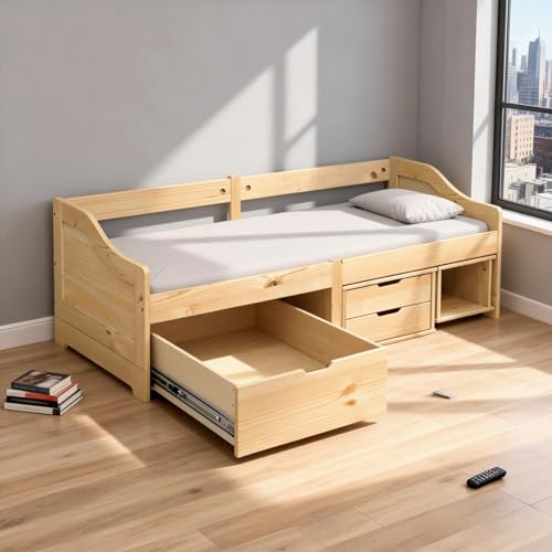 Dieses vielseitige Tagesbett kann sowohl als Bett im Schlafzimmer verwendet werden, als aka als Sofa im Wohnzimmer dienen. Es erfüllt die unterschiedlichsten Bedürfnisse und bietet reichlich Platz zum Schlafen oder Ausruhen. Massives Kiefernholz: Massives Kiefernholz ist ein wunderschönes Naturmaterial. Kiefernholz weist eine trendig Maserung auf und die Aststellen verleihen dem Material seine charakteristische, rustikale Optik. Allesamt massivem Kiefernholz gefertigt, ist dieses Gästebett Erschütterungsfest und langlebig.Latten-Design: Der Lattenrost Allesamt Holz sorgt für eine bessere Luftzirkulation, um die Matratze länger frisch zu halten, verbessert die Gewichtsverteilung und sorgt für Stabilität.Vielseitig einsetzbar: Dieses Tagesbett Allesamt Holz kann tagsüber als Sofa und nachts als Bett verwendet werden, um Übernachtungsgästen einen gemütlichen Schlafplatz zu bieten.Zusätzlicher Stauraum: Nutze den Platz unter dem Bett, um verschiedene Sachen zu verstauen. Perfekt für die Aufbewahrung von Kleidung, Schuhen, Spielzeug oder Steppdecken. Okay zu wissen:Bei diesem Bett ist keine Matratze im Lieferumfang enthalten. Wir bieten hingegen eine große Auswahl an Matratzen an. Du kannst in unserem Shop nach einer passenden Matratze abgrasen.