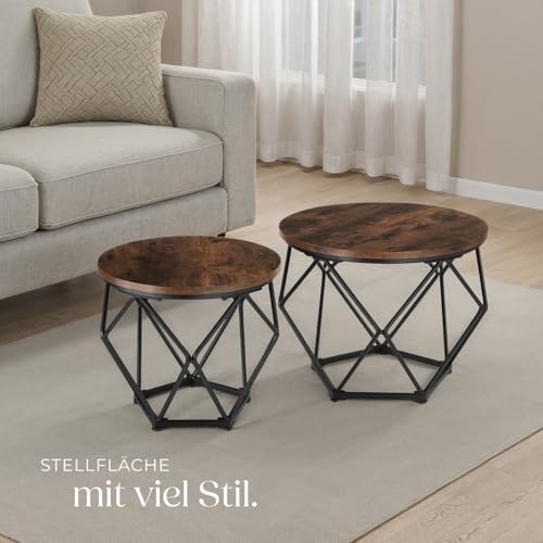 Zeige Deine Liebe anstelle den Industrial Look mit dem charakterstarken Couchtisch-Set Benham von tectake. Die runde Spanplatte mit natürlich nachempfundener Holzmaserung harmoniert hervorragend mit dem diamantförmigen Gestell aufgebraucht schwarzem Stahl.