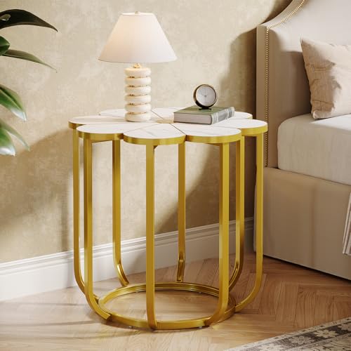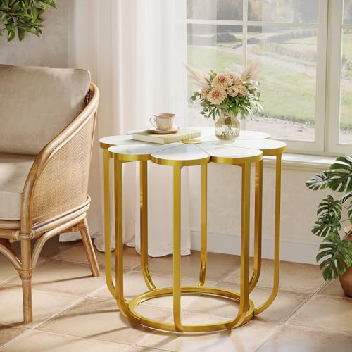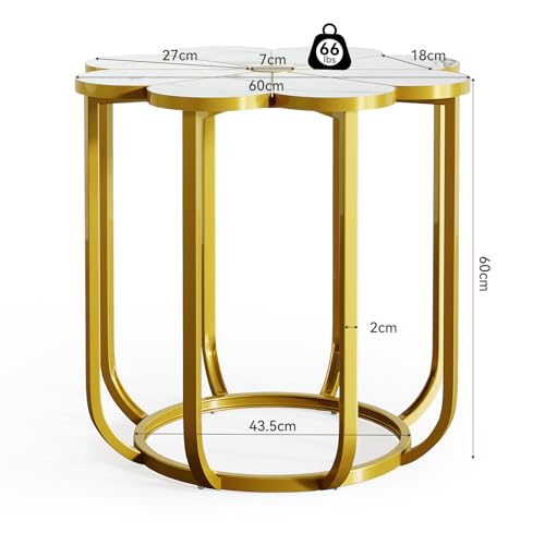 Tribesigns Beistelltisch in Weiß und Gold, 60 cm Moderner Sofa Tisch in Blumenform mit Kunstmarmor, Nachttisch mit Goldfarbenem Metallgestell, Beistelltisch Holz für Wohnzimmer, Schlafzimmer, Lounge