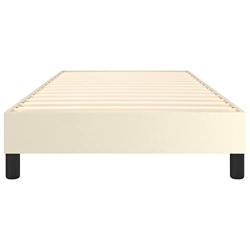 Farbe: Creme. Material: Kunstleder (75% Polyvinylchlorid, 5% Baumwolle, 20% Polyester), Sperrholz, Holzwerkstoff. Gesamtabmessungen: 203 x 100 x 25 cm (L x B x H). Passende Matratzengröße: 100 x 200 cm (B x L) (Matratze nicht im Lieferumfang enthalten).