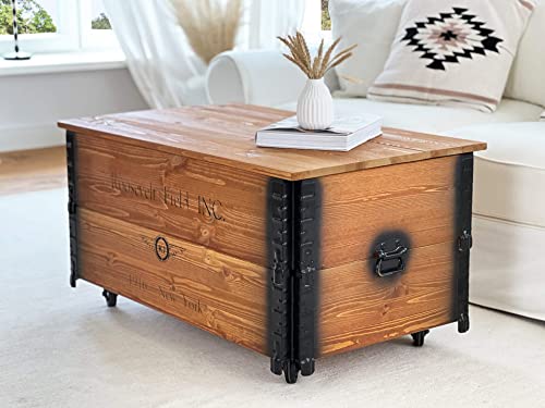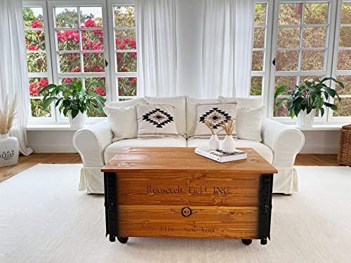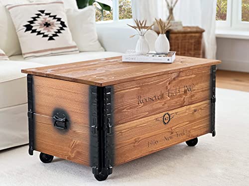 ✔ industrial Truhen-Tisch in XL Größe 100 x 58 x 51 cm, qua beidseitiger Schrift „Roosevelt Field“ bedruckt, fertig montiert (abgesehen Tischplatte)