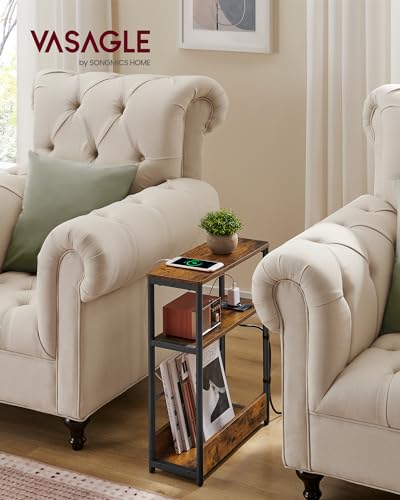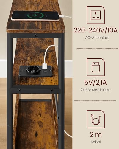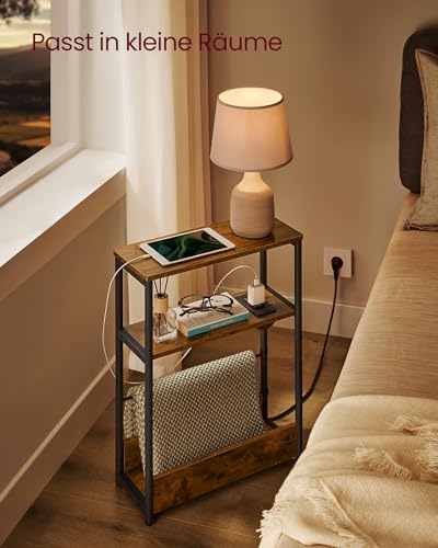 VASAGLE Beistelltisch schmal, Nachttisch mit Ladefunktion, Couchtisch klein, 3 Ablagen, Zeitschriftenhalter, für Wohnzimmer, Schlafzimmer, Arbeitszimmer, vintagebraun-tintenschwarz LET335K02