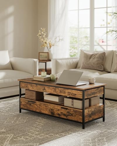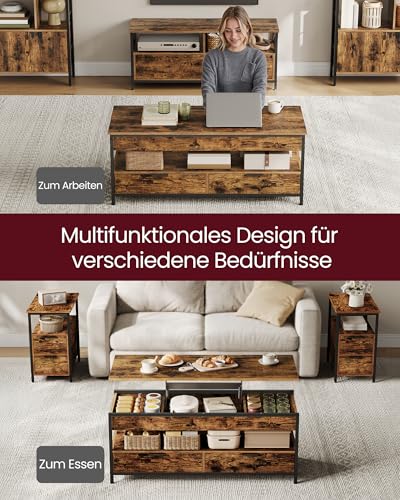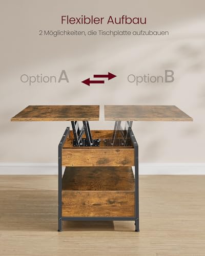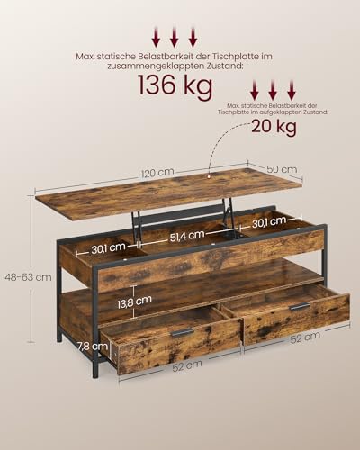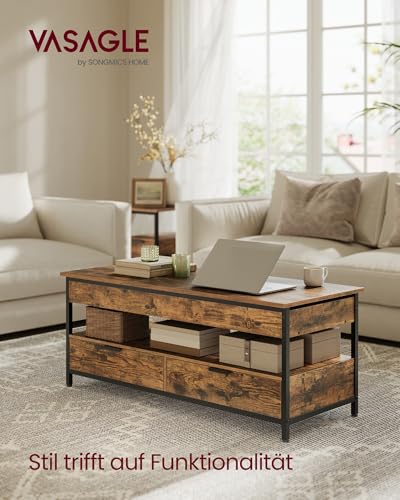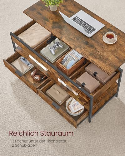 VASAGLE Couchtisch, höhenverstellbarer Wohnzimmertisch, Kaffeetisch, mit Schubladen, offenes Fach, 50 x 120 cm, vintagebraun-tintenschwarz LCT252K01