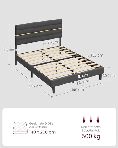 VASAGLE Polsterbett, Doppelbettgestell, Bettgestell, passend für 140 x 200 cm Matratze, verstellbares gepolstertes Kopfteil, Bettrahmen, Metall, Massivholz, modern, schiefergrau RMB504G01