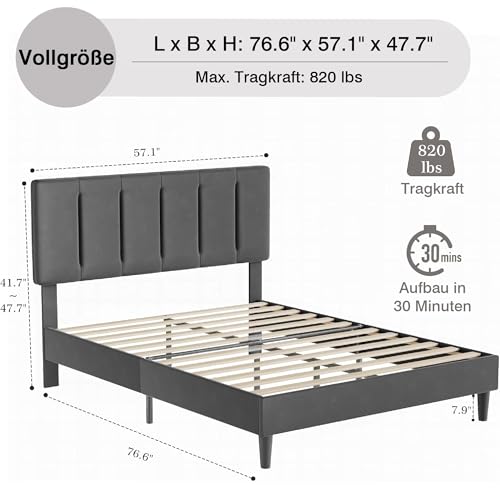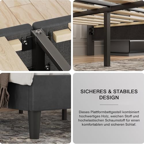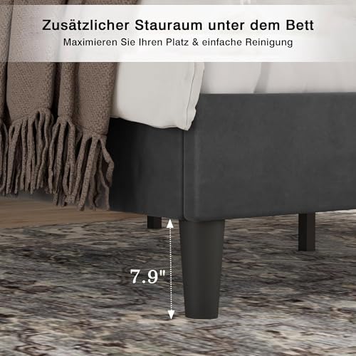 【Hohe Tragkraft】Das gepolsterte Bett verfügt über ein stabiles Holzlattenrost mit einer maximalen Belastbarkeit von 370 kg. Der stabile Metallrahmen mit 8 Beinen und 12 gleichmäßig verteilten Massivholzlatten gewährleistet optimale Gewichtsverteilung und Dauerhaftigkeit.