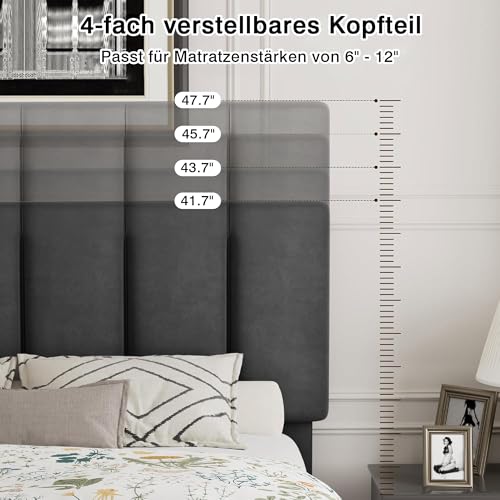 【Multifunktionales Kopfteil】Das Kopfteil ist in 4 Höhenstufen von 105 bis 120 cm verstellbar und passt sich so jeder Matratzenstärke an. Die hochwertige High-Density-Schaumstoffpolsterung bietet angenehm weiche Liegequalität und gute Luftdurchlässigkeit.
