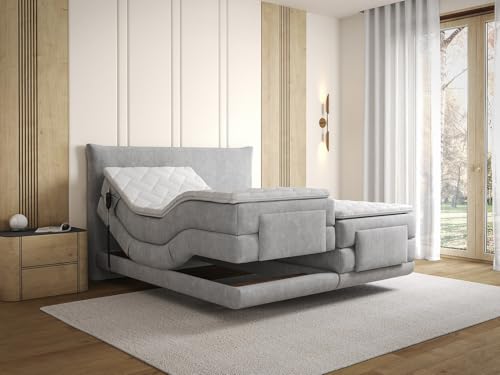Gönnen Sie sich außergewöhnliche Nächte mit dem kompletten ZANORO Boxspringbett-Set, das für Ihr absolutes Wohlbefinden konzipiert wurde. Dank der elektrischen Verstellfunktion können Sie Ihre Position zum Lesen, Entspannen oder Schlafen leicht an Ihren individuellen Komfort portieren. Bestehend aus einer 18 cm Matratze, einem Topper und einem eleganten Kopfteil, verbindet es optimale Unterstützung mit Raffinesse, um Ihr Schlafzimmer zu verschönern.Produktdetails Matratzentechnologie (Kern): Taschenfederkern Anzahl der Federn (Matratze): 520 Matratzenauflagen-Technologie: Kaltschaum Matratze (Ausgabe): Komfortschaum Dichte (Auflageseite): 25 Liegekomfort: Fest Matratzenbezug (Material): Polyester Verkleidung Farbe (Schattierungen): Hellgrau Material (Genauigkeit): 100 Polyester Struktur: Holz Größe (Liegefläche): 2 x 80 x 200 cm Anzahl Personen: 2 Personen Art der Bedienung: Fernbedienung Art des Anschlusses: Netzanschluss Mit Matratze Unterstützung: Ausgewogen Mit Lattenrost Lattenrost: Elektrisch Technologie (Lattenrost): Federkern Anzahl der Federn (Bettkasten): 276 Lattenrost mit Füßen: Dekorativ Liegeflächen: 4 Produktserie: Prestige Corner, Good for Planet Garantie: 10 Jahre Ökologische Kriterien: Hergestellt in Abendland Maximale Traglast: 240 Produkt zum Selbstaufbau Maximaler Neigungsgrad (Kopf): 61 Maximaler Neigungsgrad (Füße): 48 : 1 Fernbedienung pro Federung zur Annullierung Ihrer PositionCa.-Maße Breite: 216 cm Höhe: 126 cm Abgrund: 168 cm Liegehöhe: 67.5 cm Kopfteilbreite: 168