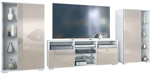Design: Der Korpus der Schrankwand in Weiß matt und die Fronten in Sandgrau Hochglanz umsorgen ein modernes, wohnliches Ambiente. Oder Entscheidung Sie aus vielen, weiteren Farbkombinationen das passende Design.