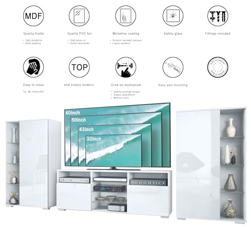 Entdecken Sie die vielseitige und moderne Davos Wohnwand, bestehend aus zwei Vitrinen und einem Lowboard. Diese Wohnzimmermöbel vereinen Qualität, Adaptivität und modernes Design, um Ihren Wohnraum stilvoll zu arrangieren. Der Vitrinenschrank bietet Ihnen höchste Adaptivität dank der Möglichkeit, die offenen Fächer links oder rechts zu positionieren und die Tür nach Ihren Wünschen zu öffnen. Mit einem robusten Korpus aus Spanplatte und einer hochwertigen MDF-Tür garantiert sie Langlebigkeit und Eleganz. Vier offene Fächer mit Glasböden bieten genügend Platz zur Präsentation Ihrer Lieblingsstücke, wegen hinter der Tür vier weitere Fächer großzügigen Stauraum für persönliche Gegenstände bieten. Der TV-Schrank bietet üppig Stauraum für Ihre Unterhaltungselektronik und Wohnaccessoires. Sechs offene Fächer eignen sich ideal für DVD-Player, Spielkonsolen oder Bücher, wegen zwei Türen mit eleganten Griffmulden versteckten Stauraum bieten. Hochwertige Materialien wie foliierte MDF-Fronten und ein Korpus aus Spanplatten mit Melaminbeschichtung gewährleisten eine langlebige und pflegeleichte Qualität. Die Medienwand ist leicht, abgehärtet und Made in Germany, was Funktionalität und Robustheit vereint.