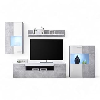 Die Wohnwand VULCAN kombiniert modernes Design mit funktionaler Gestaltung. Die Kombination aus Beton Optik und Weiß verleiht ihr einen klaren Look, der abgestimmt durch silberne Stangengriffe ergänzt wird.