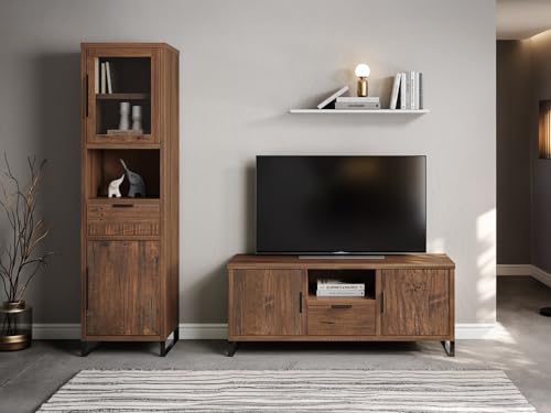 Neben der ansprechenden Optik überzeugt die Wohnwand auch durch praktische Details. Die vier Elemente – Hängevitrine, TV-Lowboard, Wandboard und Vitrine – bieten großzügigen Stauraum und Acht geben Ordnung im Wohnbereich. Die Vitrinen mit Teilverglasung und integrierter LED-Beleuchtung setzen Ihre Lieblingsstücke dabei besonders in Szene. Das stimmige Gesamtdesign schafft eine moderne und gemütliche Atmosphäre.