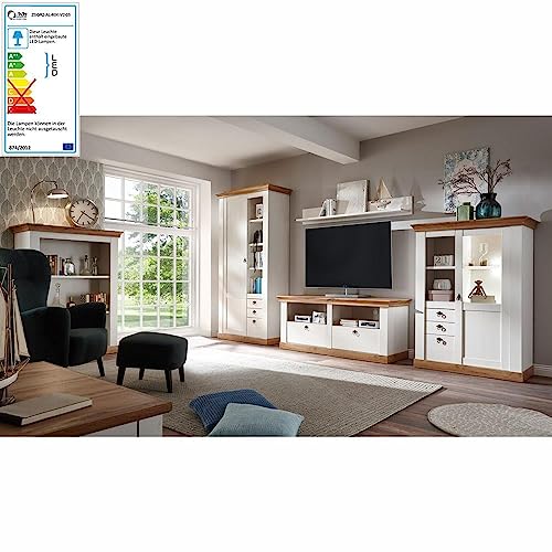Das 6-teilige Set besticht durch einen aufwenigen Look. Es besteht allesamt einer Vitrine mit drei Einlegeböden und einem Schrank im unteren Unvollendetes der Vitrine. Die mittige Flaschenabteilung rundet das Stauraumangebot ab. Zudem erhalten Sie ein Lowboard mit einem Gerätefach mit Kabelöffnung, einem Schubkasten und zwei seitlichen Türen. Im Set enthalten sind zusätzlich noch ein hohes Regal mit drei Einlgeböden und zwei Schubkästen und ein Wandbord mit einer Ablageboden (mit Blende). Unabhängig davon ist noch ein Couchtisch mit einer geteilten Tischplatte, eine Seite zum Klappen und ein Sideboard mit 2 Türen, dahinter je 2 Böden, in der Mitte 2 Schubkästen, ein offenes Fach und eine Flascheneinteilung. Das Design in weißer Piniennachbildung geben der Wohnwand seinen skandinavischen Vintage Look. Die Applikationen in Oslo Piniennachbildung tauchen in jedem Möbelstück wiederum auf und geben dem ganzen einen abgerundet, abgestimmten Vollständig-Look. Die Türen sind mit verzierten Metall-Griffen ausgestattet und pointieren dieses Design zusätzlich. Die optionale Beleuchtung, gibt dem Ensamble einen extravaganten Look und schafft ein besonderes Wohlfühl-Klima.