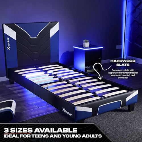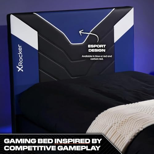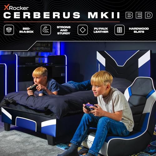 X-Rocker Cerberus Gaming Bett, 90cm Einzelbett, Holzlatten, gepolstertes Kopfteil aus PU-Kunstleder, niedriges Fußteil, ideal für Teenager, Kinder, Gaming-inspiriert, Blau, 90 x 190cm
