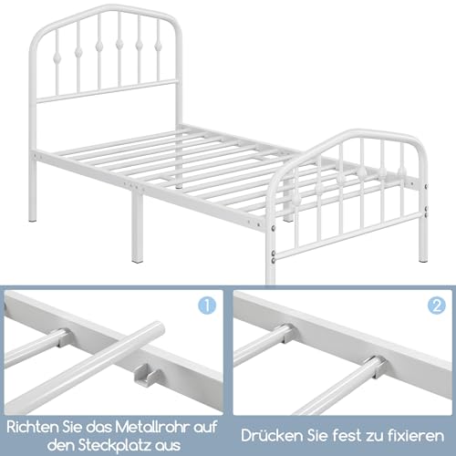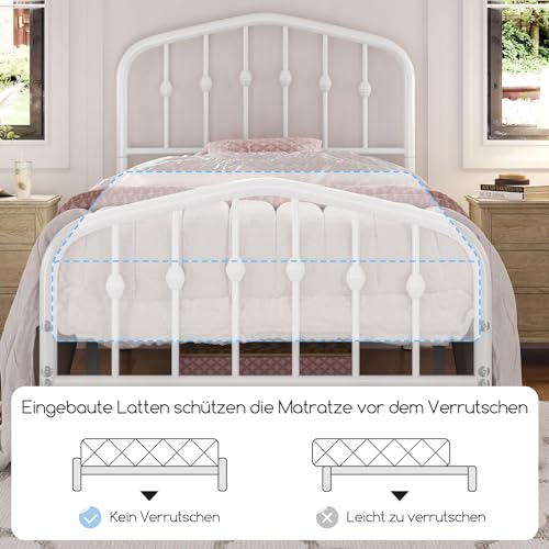 Yaheetech Bettrahmen 90 x 190 cm, Vintage Metallbett mit kronenförmigem Kopfteil, Stabiles Bettgestell Einzelbett aus Metall, Robust & Leichte Montage Gästebett Jugendbett Tagesbett, Weiß