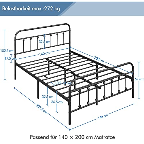 Stabil & standfest – Dieses Metallbett besteht aus dem stabilen Lattenrost, hohen Kopf- und Fußteil und 10 soliden Metallbeinen. Mit einer Tragfähigkeit bis zu 272 kg ist dieses Bettgestell für den täglichen Gebrauch geeignet.