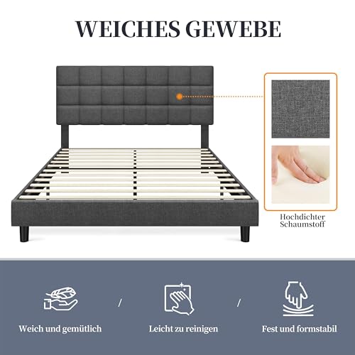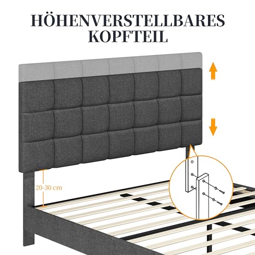Yaheetech Polsterbett 140 x 200 cm Doppelbett mit Höhenverstellbarem Kopfteil, Stabiler Bettrahmen Stoffbett mit Lattenrost, Gepolstertes Bettgestell Jugendbett, Dunkelgrau