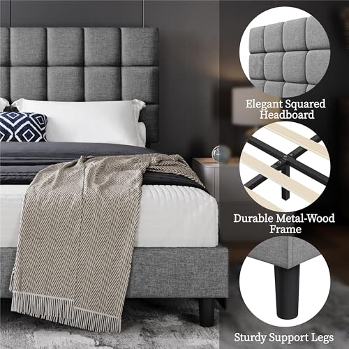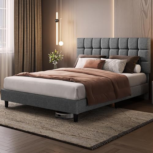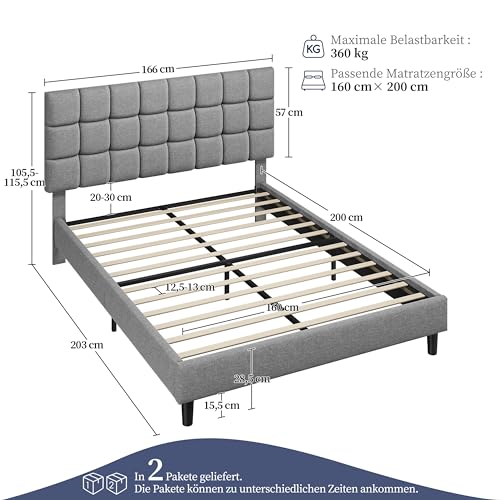 Yaheetech Polsterbett 160 x 200 cm Doppelbett mit Höhenverstellbarem Kopfteil, Stabiler Bettrahmen Stoffbett mit Lattenrost, Gepolstertes Bettgestell Bett, Hellgrau