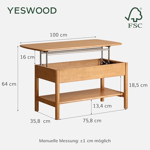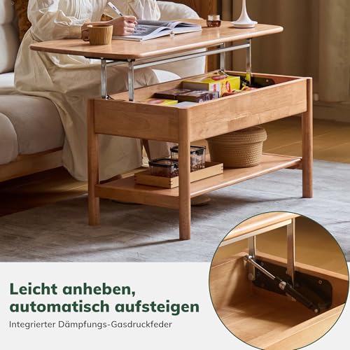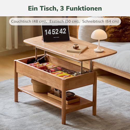 YESWOOD Höhenverstellbarer Couchtisch aus Massivholz Gummiholz, Wohnzimmertisch mit Stauraum, multifunktionaler Coffee Table & Beistelltisch, Couchtisch Holz für Wohnzimmer, 75×50×64cm, Naturfarbe