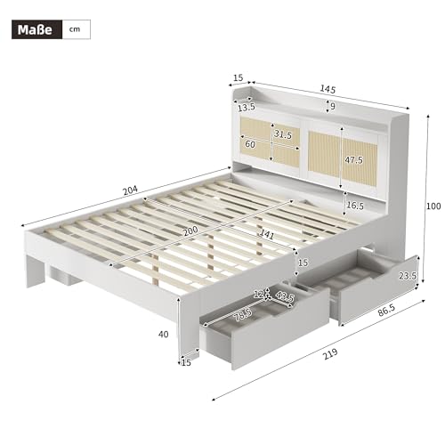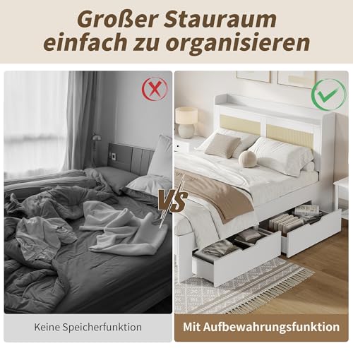 Yihomfy Stauraumbett 140 * 200cm, Doppelbett, Funktionsbett,Massivholzbett mit Rattan-Dekor, Schubladen, mit Stauraum, ohne Matratze, für Erwachsene und Jugendliche geeignet, weiß