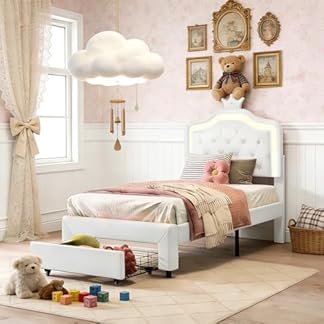 200,99 €Produkt kaufenFEEOHOME Kinderbett für Mädchen 90 x 200 cm, Prinzessin Bett mit 1 Schubladen und LED, gepolstertes Doppelbett, Bettrahmen mit Lattenrost und Verstellbares Kopfteil für Jugendliche, Weiß PU