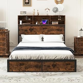 COSTWAY Bett mit Ladestation, 140x200cm, Kopfteil mit Stauraum, Bettgestell mit Lattenrost, Bettrahmen, Doppelbett, Metallbett ohne Matratze, Industrie-Design, Rustikales Braun